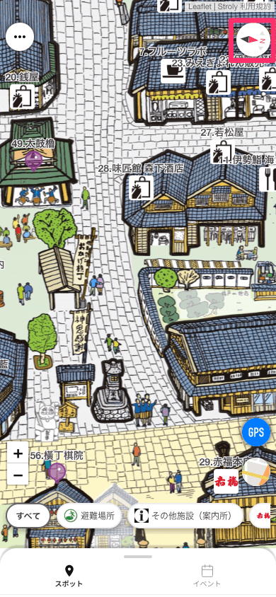 When the illustration map is rotated, press the compass button at the top right to return to the map open state.