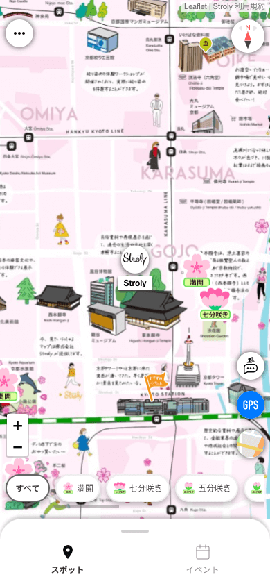 In the illustrated map view, you can walk around the local area while enjoying the design of the map. Also, you will find information about the local area and spots displayed only on the illustrated map view allowing you to enjoy the area more.