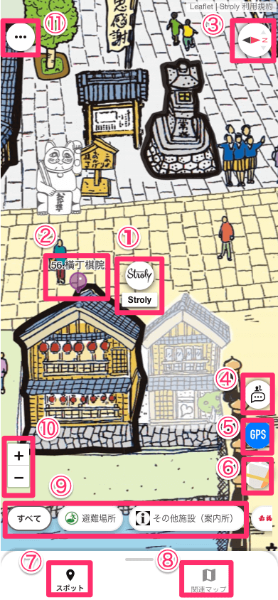 イラストマップと標準マップを切り替えるボタンです。標準マップ表示時には、設定ボタンのマップ切り替え先で選択されているマップが表示されます。