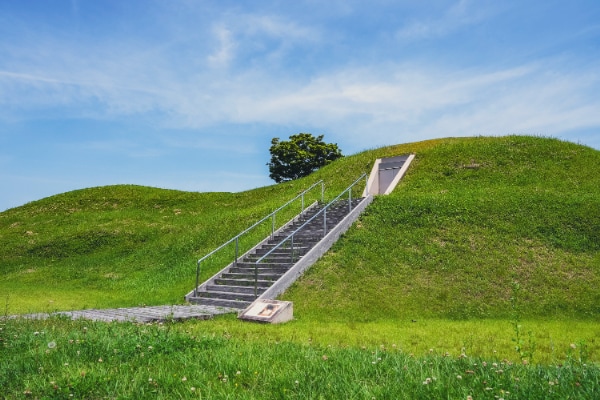 宮内庁が管理する斉明天皇とその娘・間人皇女の合葬陵。陵前には斉明天皇の孫娘にあたる大田皇女の墓も造られており、更には8歳で亡くなった皇孫の健王も自分の陵に埋葬するよう、斉明天皇が遺言を残したと伝わる。古代飛鳥で活躍した女性たちの痕跡を辿る「日本遺産」の中でも、家族愛に溢れた陵墓のひとつ。斉明天皇といえば、一度退位して再び皇位に就くという、日本史上初の譲位と重祚(じゅうそ)をなした女帝である。その陵墓については、『日本書紀』天智天皇6(667)年2月27日の条でこう記されている。「天豊財重日足姫天皇(斉明天皇)と間人皇女とを小市岡(現在の越智崗)上陵に合せ葬せり。是の日に、皇孫大田皇女を、陵の前の墓に葬す」。天智天皇こと中大兄皇子は、母である斉明天皇と妹の間人皇女を一緒に眠らせ、娘の大田皇女も寄り添うようにして陵前に葬ったとされている。また、斉明天皇は若くしてこの世を去った中大兄皇子の子・健王を可愛がっていたことから、「万歳千秋の後に、要ず朕が陵に合葬れ」と群臣に命じ、孫を想って挽歌も詠んでいる。宮内庁はこれまで、車木ケンノウ古墳を斉明天皇陵として管理してきたが、平成22(2010)年に成果が発表された明日香村教育委員会の発掘調査により、牽牛子塚古墳こそが天皇陵である可能性も高まってきている。 ●公式サイトはこちらhttps://sightseeing2.takatori.info/saimei/