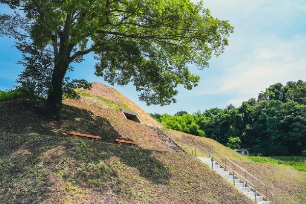全長66m、高さは10mに及ぶ、古墳時代の後期を代表する典型的な前方後円墳。奈良県立橿原考古学研究所が行った昭和53(1978)年の発掘調査では、後円部に横穴式石室が見つかり、凝灰岩製の巨大な家形石棺も確認された。昭和56(1981)年に国指定史跡となるも、現在は公園として整備され、外から内部を見学したり、墳丘に登ることも可能。高取町教育委員会による平成16年の再調査では、横穴式石室の閉塞状況などが改めて分かり、新たに石棺を石室の奥へ運ぶために掘られた墓道も確認された。全長9.45m、幅2.45mの石室は、玄室部分の高さが3mあり、長方形の平面形状から片袖式の横穴式石室となっている。石室の基礎石は全国の古墳でも数例しかない、非常に貴重なもの。納められた石棺は長さ2.61m、幅1.27m、高さ1.39mを誇り、奈良県内でも最大級の規模という。また、後円部から前方部にかけた墳丘一段目の平坦部を発掘したところ、円筒埴輪が出土。10cm間隔で並ぶように立つ埴輪の列は、当時の位置を保ったままと思われる。この他にも、「木の埴輪」と呼ばれる木製の鳥形埴輪も出土しており、平成19(2007)年には全長が3m近くに達しそうな板状の木製品が見つかったと発表され、話題となった。毎年夏には「高取町ふるさと夏まつり」の一環として幻想的な燈火会が行われている。 ●公式サイトはこちらhttps://sightseeing2.takatori.info/hakayama/