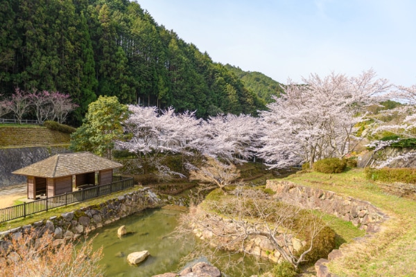 橿原市との境目に位置し、標高は210.3m。山頂には麓の人々が雨乞いをした「牛頭(こず)天王の塚」と呼ばれる直径約3mの円墳があり、南北朝時代には越智氏の山城が塚の上に築かれた。山城は元々、越智居城の詰め城であったが、後に本城となって高取城を詰め城にするまで発展した。貝吹の名はホラ貝を吹き、敵襲を知らせたことに由来。貝吹山とその周辺には数多くの古墳や御陵をはじめ、越智氏が代々崇敬した有南神社や菩提寺として建立された光雲寺など、中世豪族ゆかりの社寺も点在する。見晴らしのいい山頂には「貝吹山城址」と刻まれた石碑が立ち、現在は曲輪と石垣の一部を留めるのみながら、かつては主郭を中心に四方の屋根上にも諸郭が連なっていたという。そもそも貝吹山城は、越智谷にあった居城を守る櫓代わりに築城され、越智本城の北方に点在していた家城と呼応し、敵の見張り役を務めていた。それが天文期(1532~1555年)に入ると防備施設が強化され、戦になれば越智氏は本城を出て、この山城へこもるようになる。やがては高取城を詰め城とし、貝吹山城を本城とした。越智氏は応仁の乱が起こる前後、室町時代の後半に最盛期を迎えるも、戦国時代には争乱続きで貝吹山も戦場と化す。遂には永禄11年(1568)年、織田信長方の松永氏との合戦に敗れ、貝吹山は落城することとなる。 ●公式サイトはこちらhttps://sightseeing2.takatori.info/kaibukiyama/