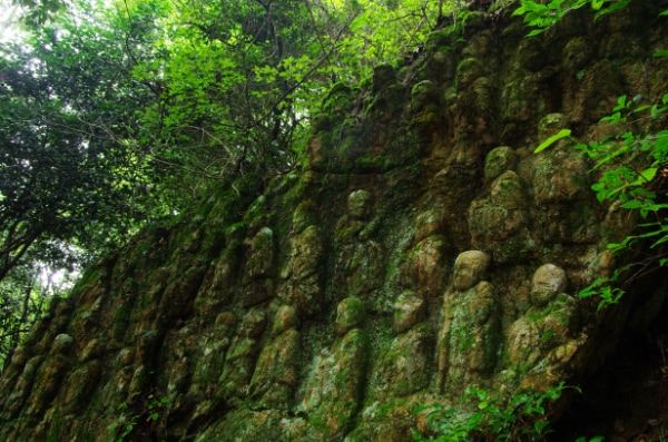 直径20m前後の円墳と見られていたが、平成20(2008)年の再調査によって一辺およそ36mの方墳と判明した。特筆すべきは横穴式石室の天井が極めて高いこと。明日香村の石舞台古墳(高さ4.8m)をも凌ぐ、5.27mという県最大の高さを誇る。同集落の鑵子塚古墳、寺崎の白壁塚古墳と共に、与楽古墳群として平成25(2013)年に国史跡となった。貝吹山の南麓に築かれた古墳は墳丘の崩落が激しく、原型や規模が分からないために円墳と思われてきた。ところが、高取町教育委員会が国の史跡指定を目指して行った再調査により、二段構造の方墳であったことが明らかに。古墳の床面に堆積していた土砂を除いたところ、石室の天井高は5.27mにまで達することも判明した。床面からは副葬品のミニチュア土器片など、渡来人系の古墳に多い遺物が出土しており、床面の中央には木棺を載せる棺台の跡も検出された。埋葬施設は両袖式の横穴式石室。石室を包む四方の壁には石が4~5段に積み上げてあり、高く取った天井部分は一枚の巨石から成る。このような石室の構造や渡来系の出土遺物は、カンジョ古墳が東漢氏の首長墓であった可能性を示唆する。更に平成27(2015)年の調査では、石室の入口を閉じる石の下から7世紀末~8世紀初めの土器片が出土。古墳の築造は6世紀末~7世紀初めと推測されるため、その約100年後に追葬があったと見られる。●公式サイトはこちらhttps://sightseeing2.takatori.info/kanjyo/