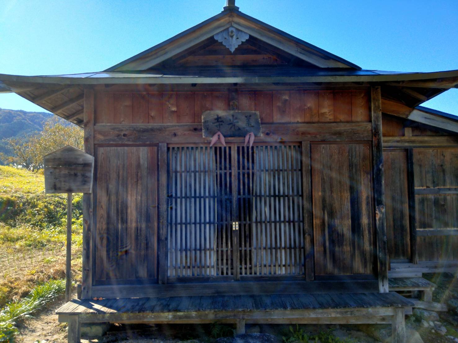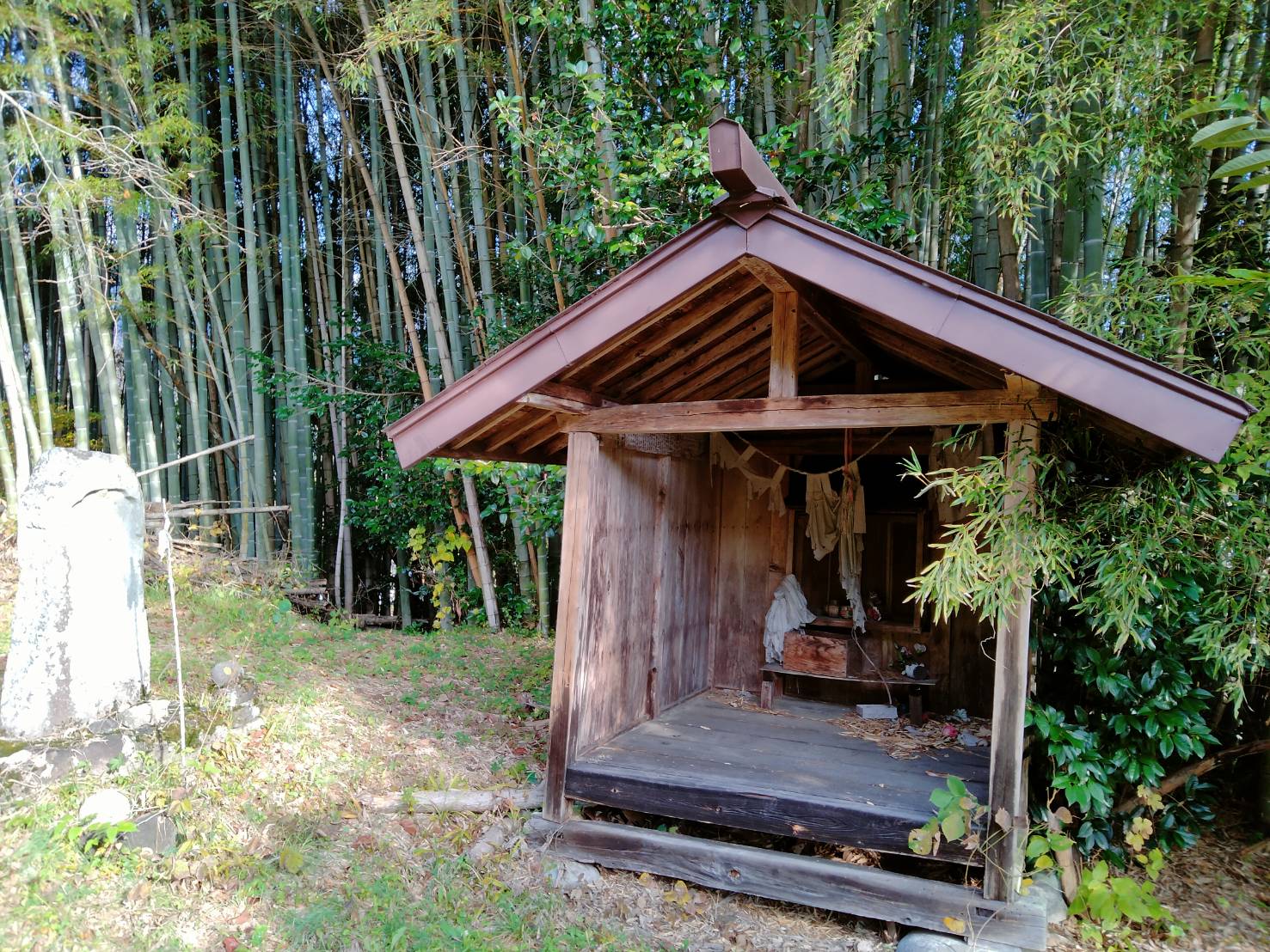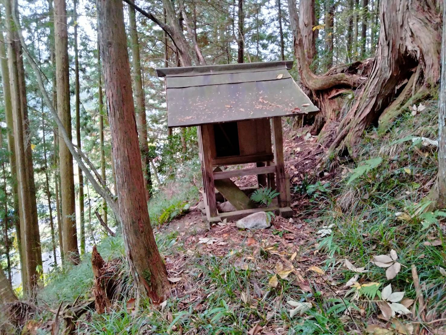 場所|長野中地区、善光寺の上にある出雲神社と彫られた常夜灯を過ぎて、200mほど休耕田のあぜ道を上り、右手の山にはいります。急な坂道を上ると、20分ほどで尾根道にでます。そこから、尾根に沿って南東方向に登ります。途中、送電線の鉄塔を過ぎて、巻き道に入り、20分ほど登った山の中腹に小さな広場があります。出雲神社の小さな祠はその上にありまする。 沿革|最初は、木曽義仲が木曽南部の安定を祈願して、現在の須原定勝寺の前身であった観心坊の僧に祀らせたといわれています。その後、出雲神社の祀られている山のふもとに円行寺(現在の善光寺)という寺を建て、そこの僧に守らせたと伝えられています。明治の初めに神仏分離政策のもと、建物も壊され、ご神体とされていた仏像も一部焼かれてしまったそうですが、昭和3年に現在の建物で再建されました。昭和3年の再建に携わった人たちの銘板は建物の横にかけられていますが、長年の風雪に墨の色は落ちてしまっています。 宝物など|この神社に伝わる三鈷杵、五鈷杵は鎌倉、室町時代のものと推定され、ともに村が文化財に指定しています。祭日は旧暦の9月15日で、30年ほど前までは、山中の祠の前で、湯立ての舞などが行われていたそうですが、現在は行われていません。記録|木曽路名所図会(文化2年:1805 秋里籬島)には以下のように記述されています。「出雲明神社祠(いづもみやうじんのやしろ) 村民(そんみん)これを祀(まつ)る。いにしへ木曽殿(きそどの)これを建(た)つる。其頃(そのころ)は須原(すはら)観心房(くわんしんぼう)守(まも)る。例祭(れいさい)八月(ぐわつ)十五日(にち)。阿弥陀堂(あみだだう) 出雲祠(いづものやしろ)の境内(けいだい)にあり。弥陀(みだ)の大像(だいざう)を安置(あんち)す。本地仏(ほんぢぶつ)とす。」*本地仏…本地垂迹説(神道の神が、本来は仏教の神であったという考え方)において、祀られている神道の神の本来の姿とされる仏や菩薩をさす。参考文献大桑村の神社調査報告書 長野県木曽郡大桑村教育委員会 昭和56年『大日本名所図会 第2輯 第1編』大日本名所図会刊行会 編 大日本名所図会刊行会 大正8年八十二文化財団 文化財・文化施設検索HP 2025/7/19閲覧