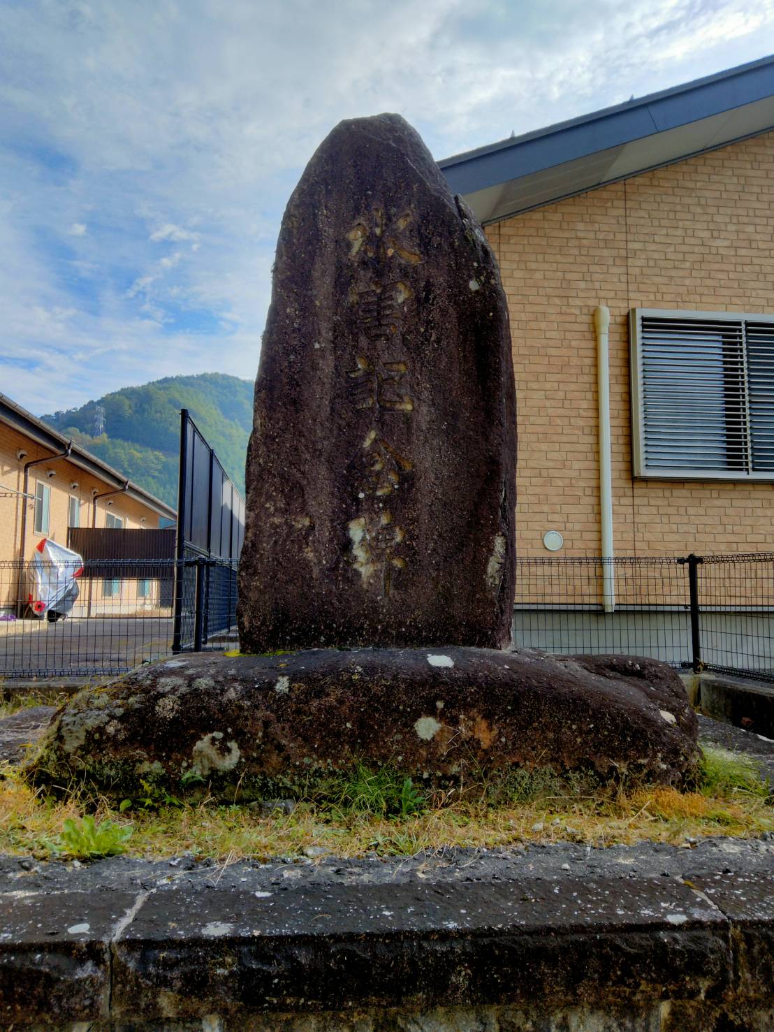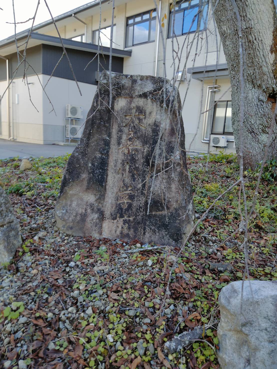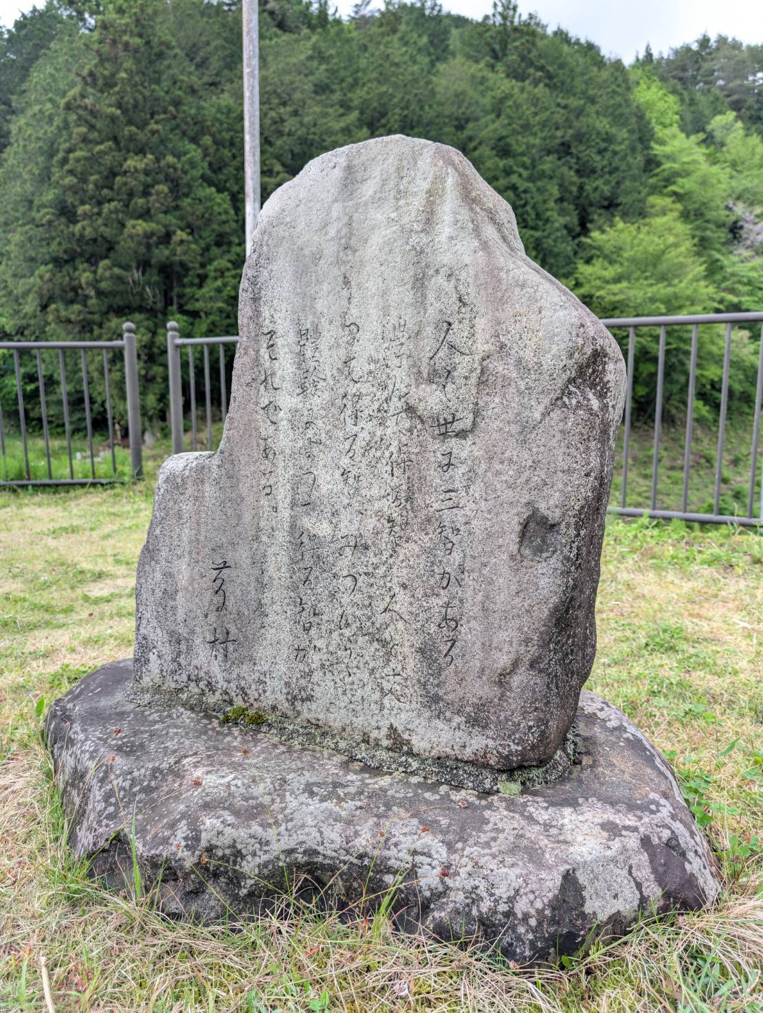 人の世に三智がある。 學んで得る智、 人と交って得る智、 みずからの體験(たいけん)によつて得る智がそれである。 昭和46年度大桑中学校卒業生が卒業記念品として学校に送ったものである。言葉は郷土の文豪であった島崎藤村の言葉が一番いいということで刻まれた。石は当時の先生方が見つけた御岳安山岩である。PTAの有志で川から引き揚げたそうだ。彫ったのは弓矢の石屋である南山浦太郎だそうだ。 島崎藤村は現在の岐阜県中津川市妻籠で生まれた詩人、小説家である。本名は島崎春樹。 参考文献 大桑中学校生徒会誌『清流』第19号(1971)