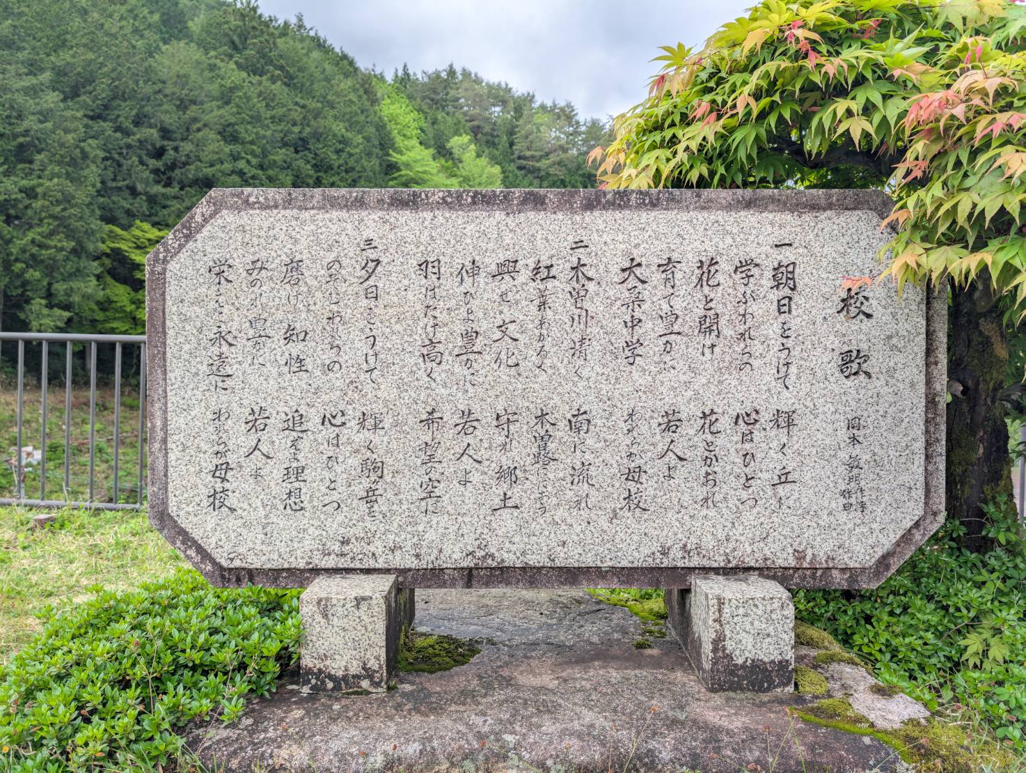 大桑中学校の校歌は昭和31年6月10日に制定された。 作詞作曲は岡本敏明であり、昭和時代に活躍した日本の音楽家であり近隣を含め様々な学校の校歌を作られた。 この石碑は昭和52年10月29日に校門と一緒に設置されたそうである。 岡本先生は「どうぞ皆様が朝に美しい山を迎ぎ夕べに静かな川辺を散歩するとき、口笛ででもこの校歌を愛唱して下さい。」と書かれている。 参考文献 大桑中学校沿革誌委員会『大桑中学校沿革誌創立20周年記念』(1968)